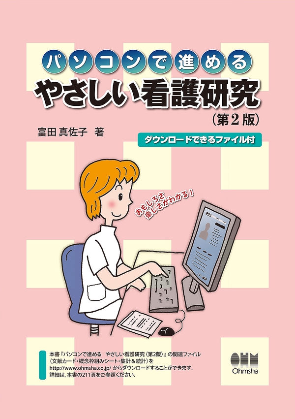 このサイトでは『パソコンで進める やさしい看護研究』で使用するファイルと本の内容を動画にしたものを公開しています。著者は、数年にわたり臨床現場で働く看護師を対象に看護研究のアドバイザーをしてきました。当初は上手く説明できず悩むこともありましたし、正直なところ後悔の残る経験もありました。それでも、悩む若い看護師たちの表情が、パッと晴れて生き生きと輝いた笑顔になった時は、最高の喜びでした。本書はその経験から書き上げたものであり、入門書です。「初めて」から「次のステップ」に進まれる時には、他の専門書を読まれることをお勧めします。